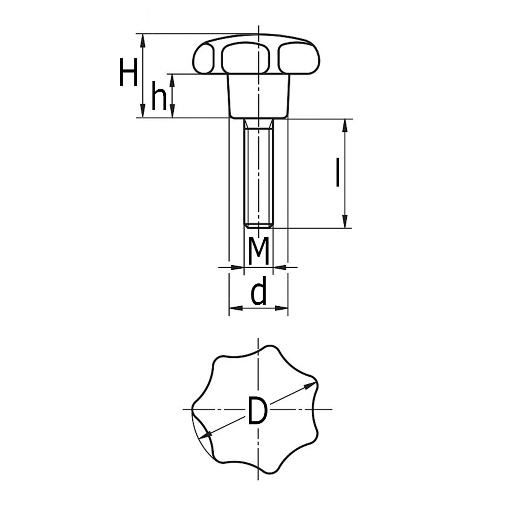 D=knob Ø, d=shaft Ø, H=total height, h=height, I=thread length, M=thread size, Type= threaded insert material