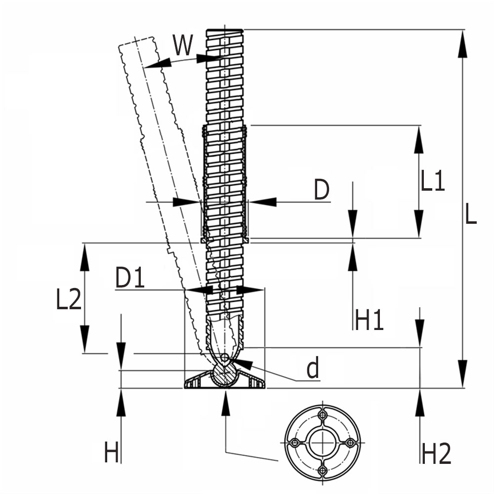 D=shoulder Ø, D1=foot Ø, H=foot height, H1=shoulder thickness, K=maximum static load capacity in kg, L=total length, L1=shaft length, L2=adjustment range, Model=wall thickness, SW=spanner size, Tube size=external tube dimensions, W=angle of inclination in °