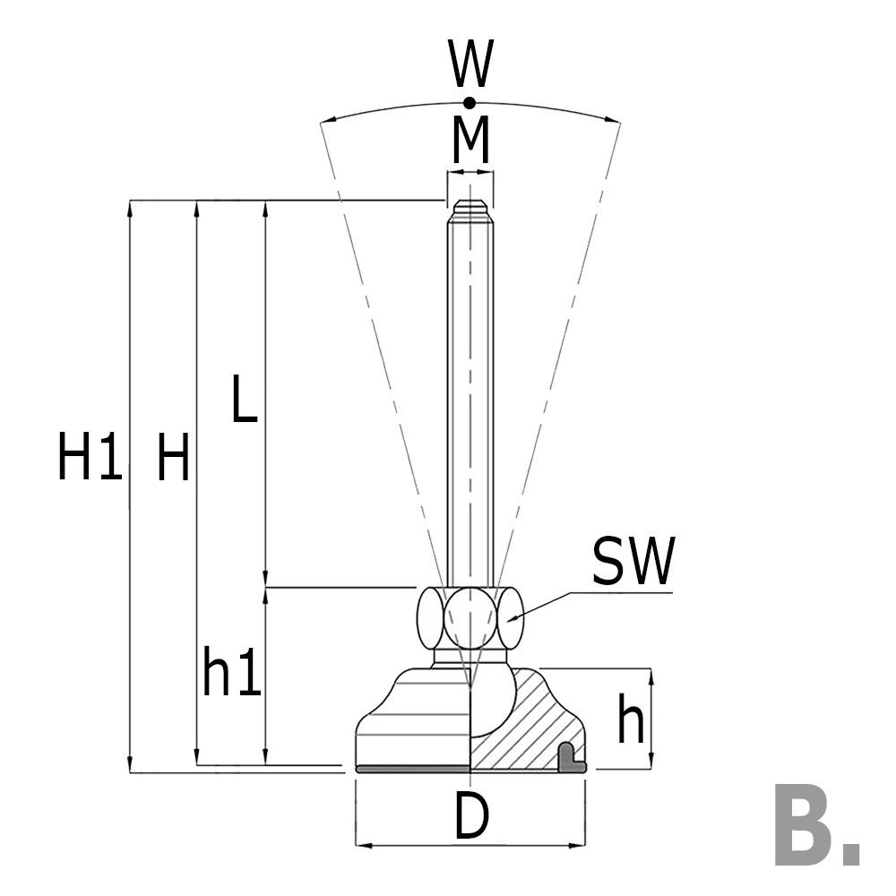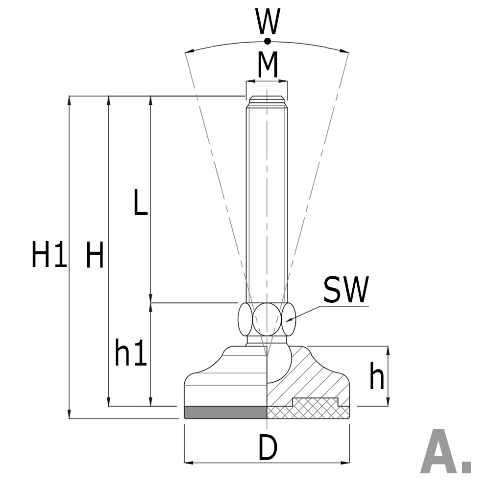 D=Base-Ø, H=Total height excluding anti-slip sole, h=Height, H1=Total height, h1=Base height, K=Maximum static load in kg, L=thread length, M=thread size, SW=Spanner size, W=Angle in °