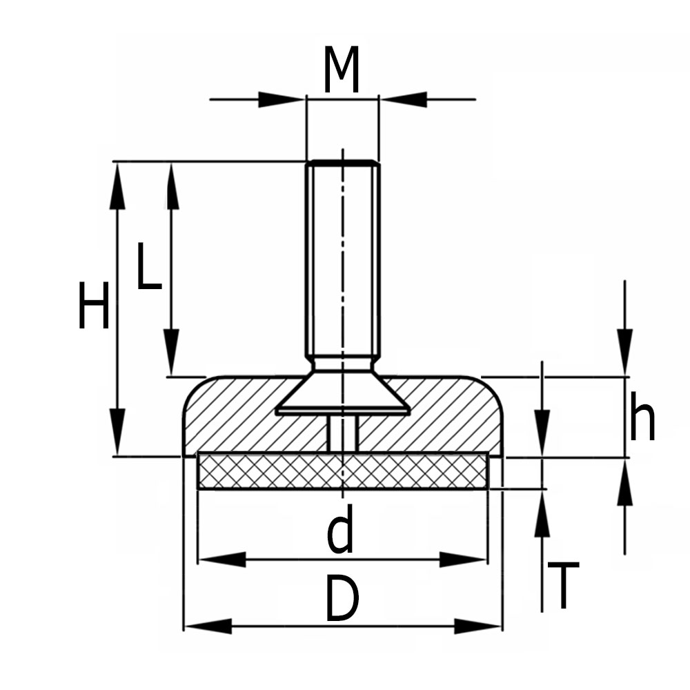 D=base Ø, d=felt Ø, H=base height, h=felt thickness, L=effective usable thread length, M=thread size
