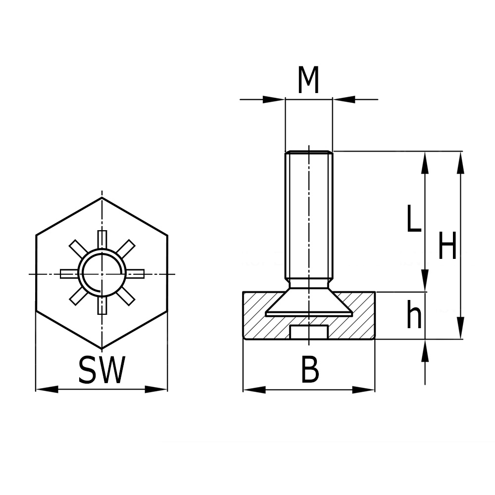 - This hexagonal levelling foot is used as a height adjuster for furniture and equipment.