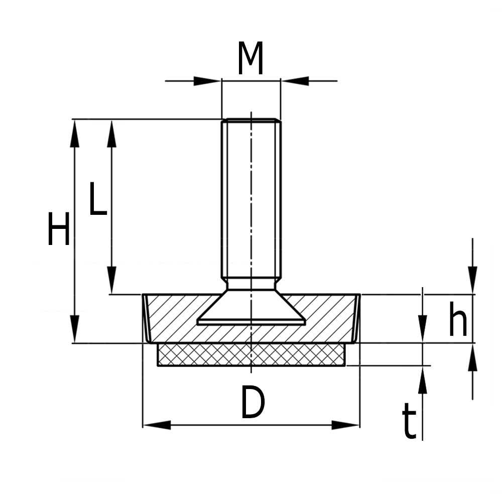 D=base Ø, H=base height, L=effective usable thread length, M=thread size, t=felt thickness