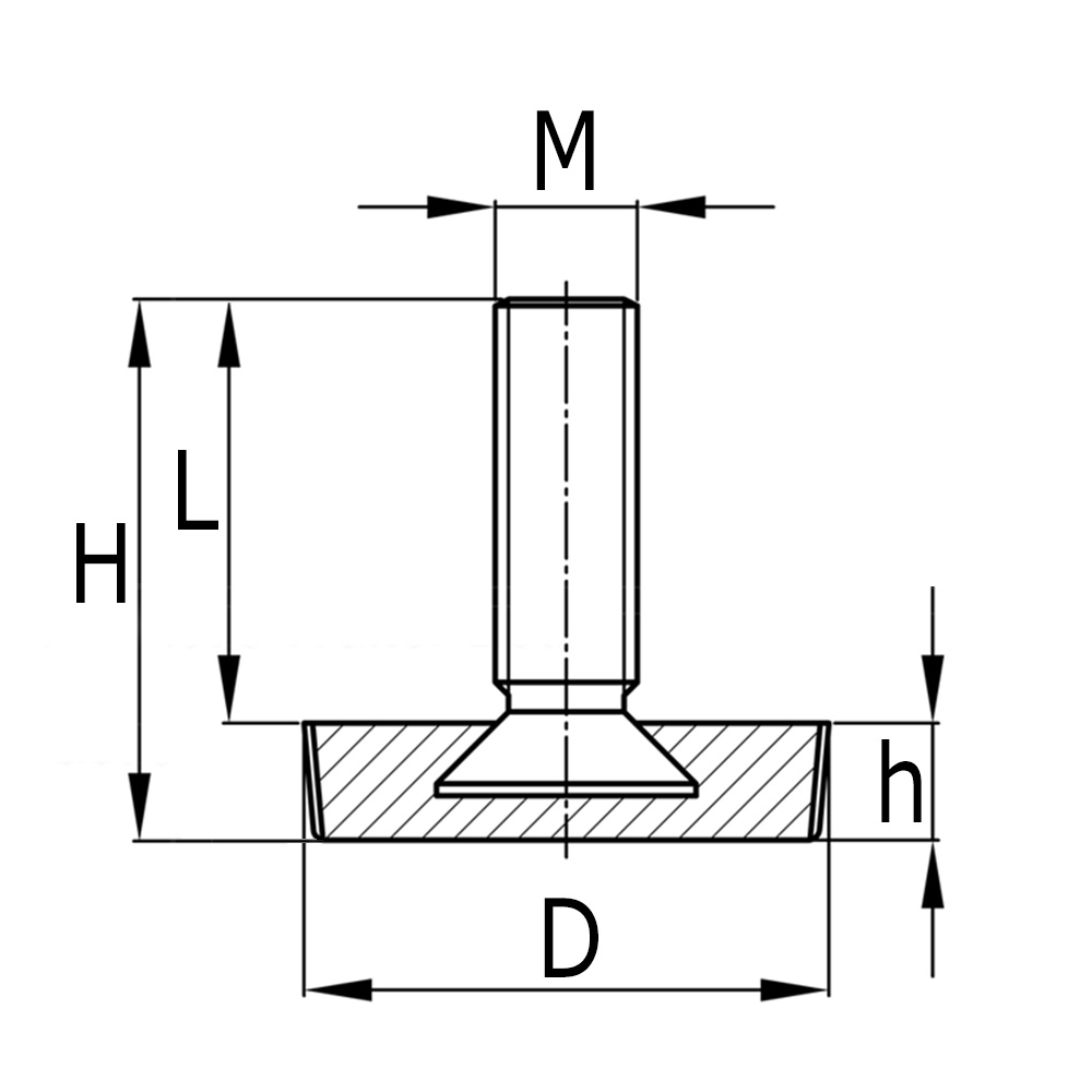 D=base Ø, H=base height, L=effective usable thread length, M=thread size