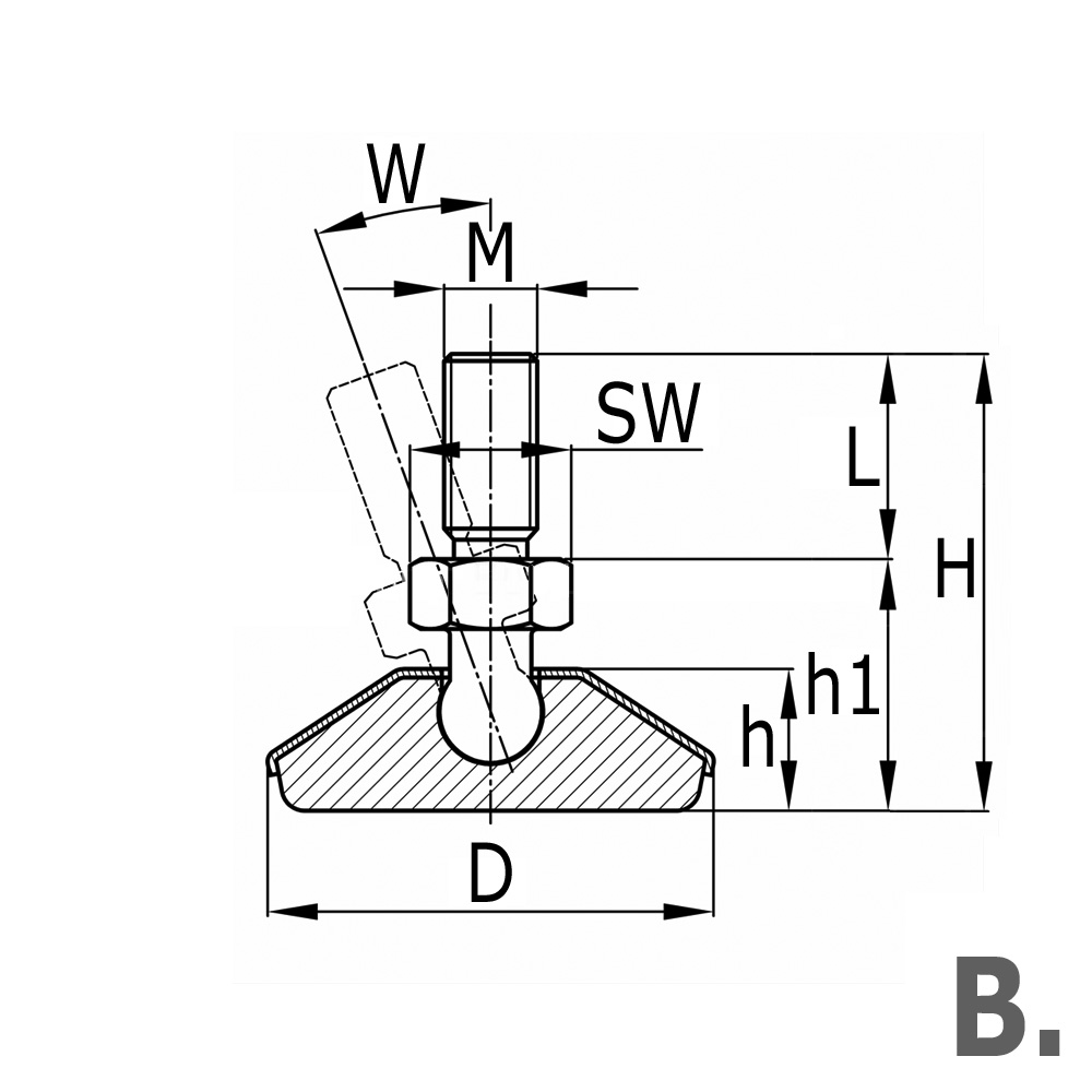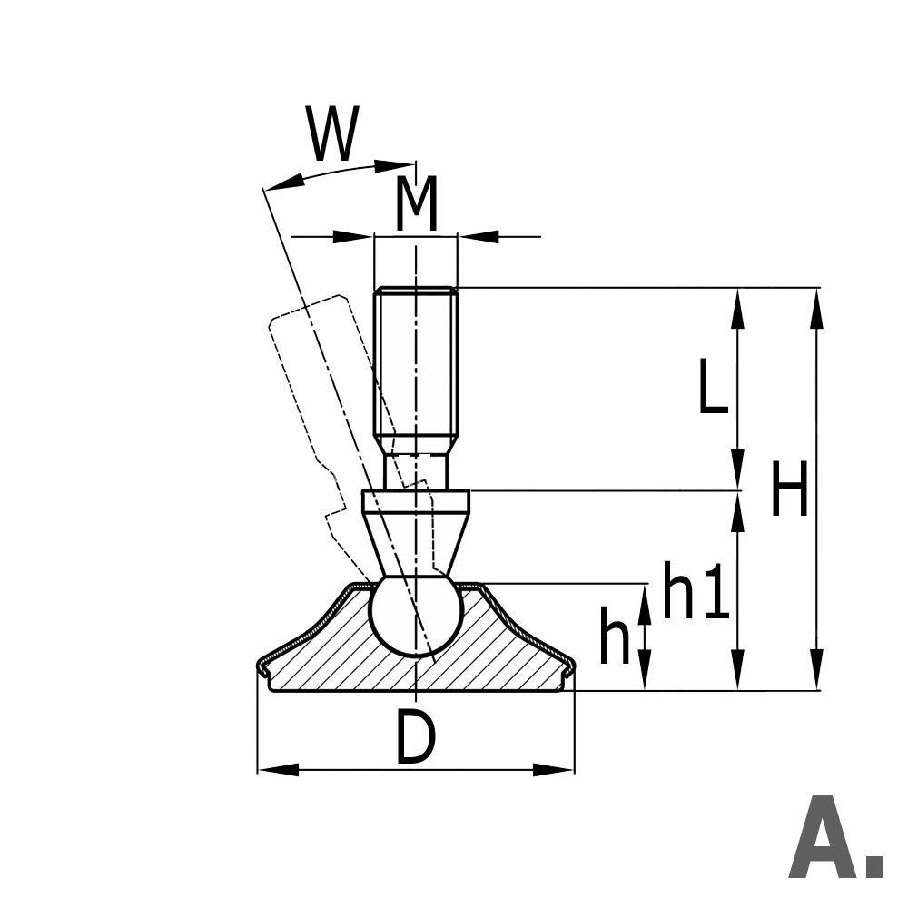 D=base Ø, h=height, h1=base height L=stem length, M=stem thread size, Mat.=Material, Model=nickel-plated/chromed, Type=variant, W=maximum tilt angle in degrees