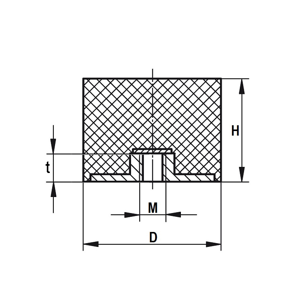 D=diameter, H=height, M=thread size, Mat. A=type of rubber, Mat. B=Material metal components, N=Maximum static load in Newton, Shore A °=Shore-A hardness of the rubber, t=depth of thread