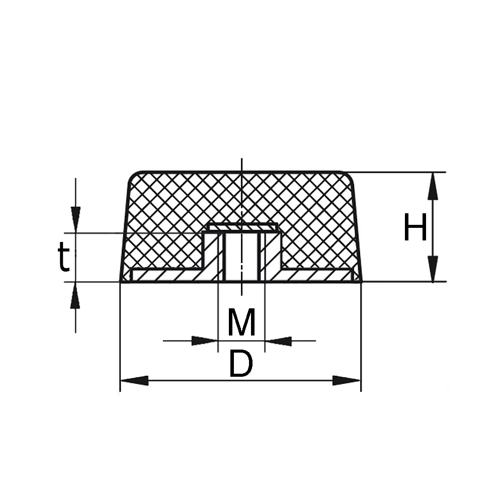 D=large Ø, H=height, M=thread size, Mat. A=type of rubber, Mat. B=Material metal components, N=Maximum static load in Newton, Shore A °=Shore-A hardness of the rubber, t=depth of thread