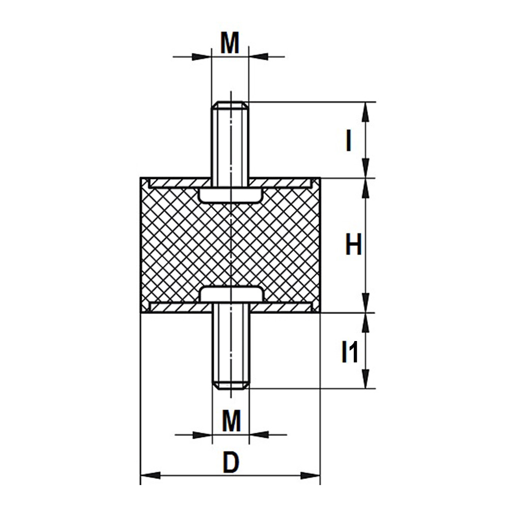 D=diameter, H=height, l=length of thread, M=thread size, Mat. A=type of rubber, Mat. B=Material metal components, N=Maximum static load in Newton, Shore A °=Shore-A hardness of the rubber