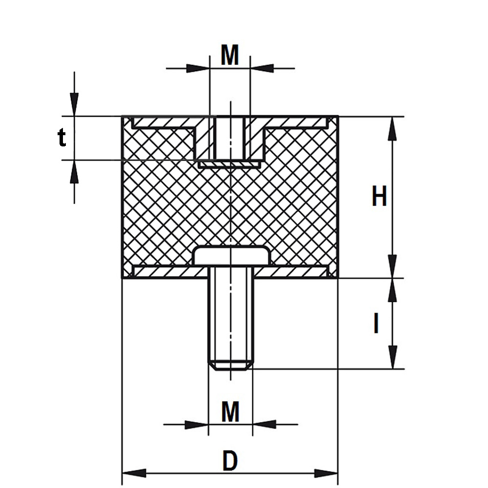 D=diameter, H=height, l=length of thread, M=thread size, Mat. A=type of rubber, Mat. B=Material metal components, N=Maximum static load in Newton, Shore A °=Shore-A hardness of the rubber, t=depth of thread