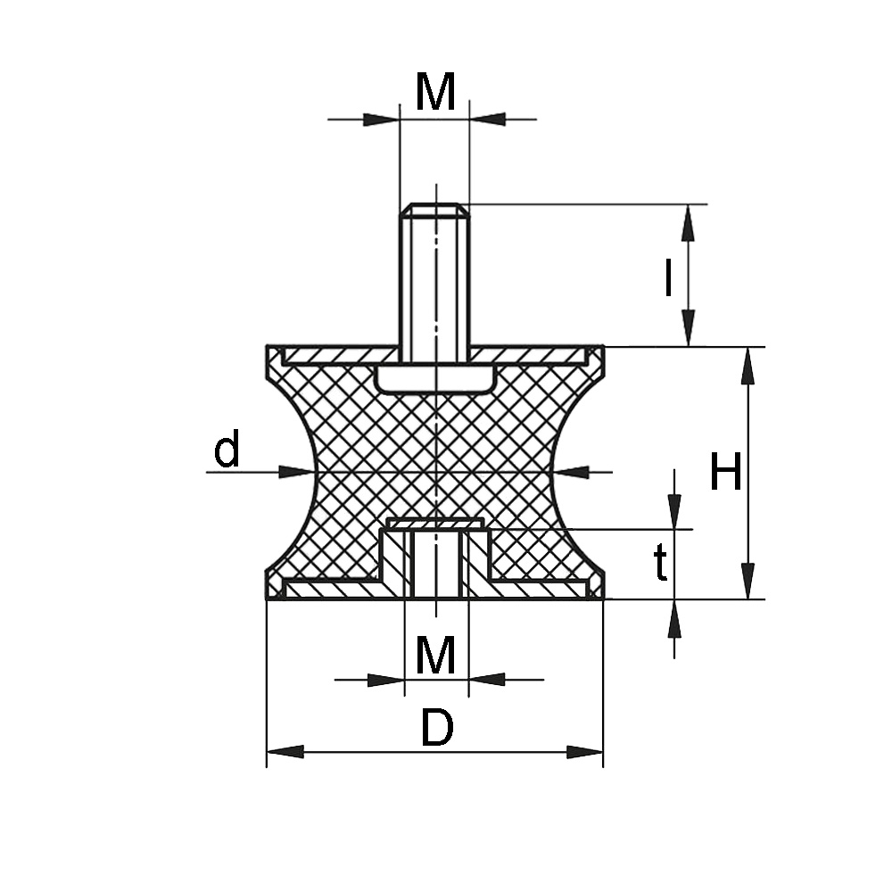D=large Ø, d=waist Ø, H=height, l=thread length, M=thread size, Mat. A=type of rubber, Mat. B=Material metal components, N=Maximum static load in Newton, Shore A °=Shore-A hardness of the rubber, t=depth of thread