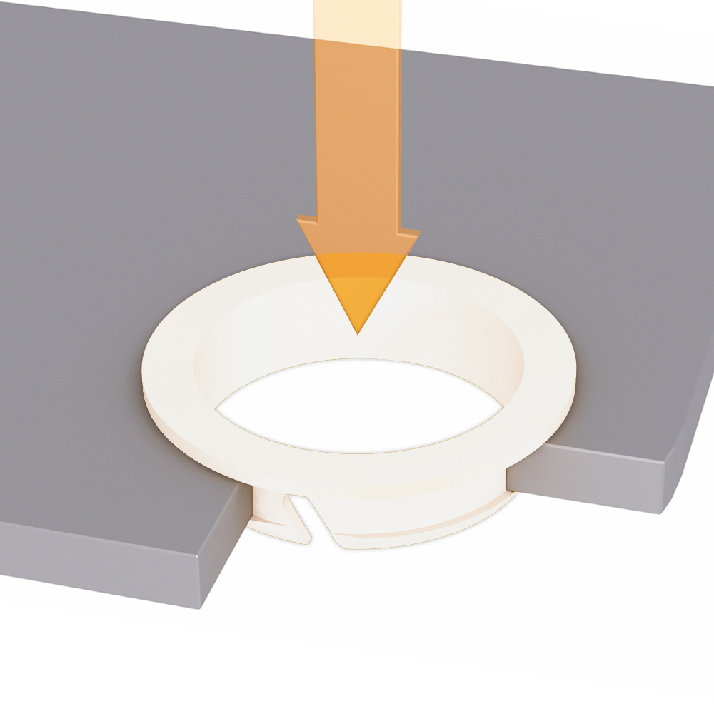 - Plastic plain bearings with double flange (clip bearing) for sheet metal applications, available for shafts from Ø3 mm up to Ø25 mm