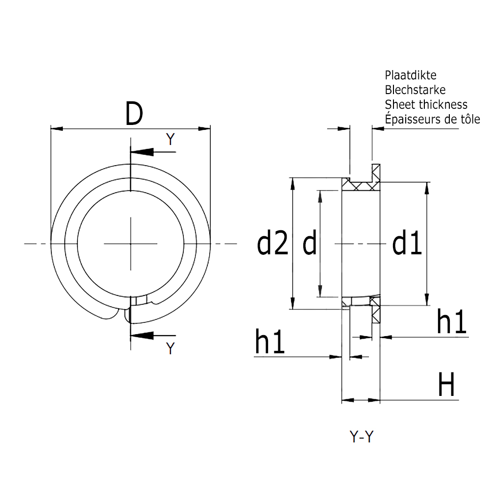 Bore=Bore bearing housing/mounting hole, D=flange-Ø-large, d=bore-Ø, d1=shaft-Ø, d2=flange-Ø-small, H=total height, h1=flange thickness