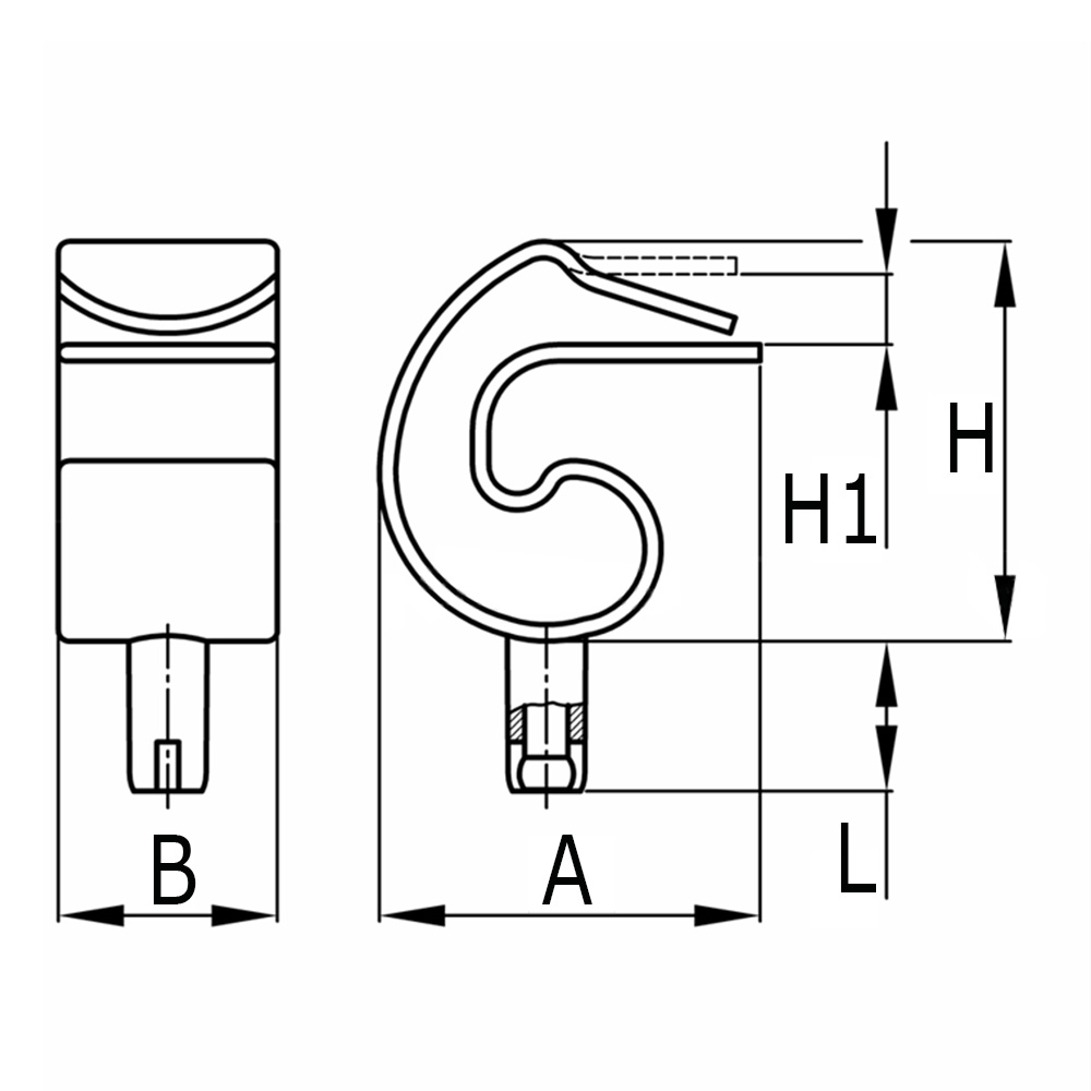 A=length, B=width, H=height, H1=clamping range, L=pin length, Thickness=thickness clamping range