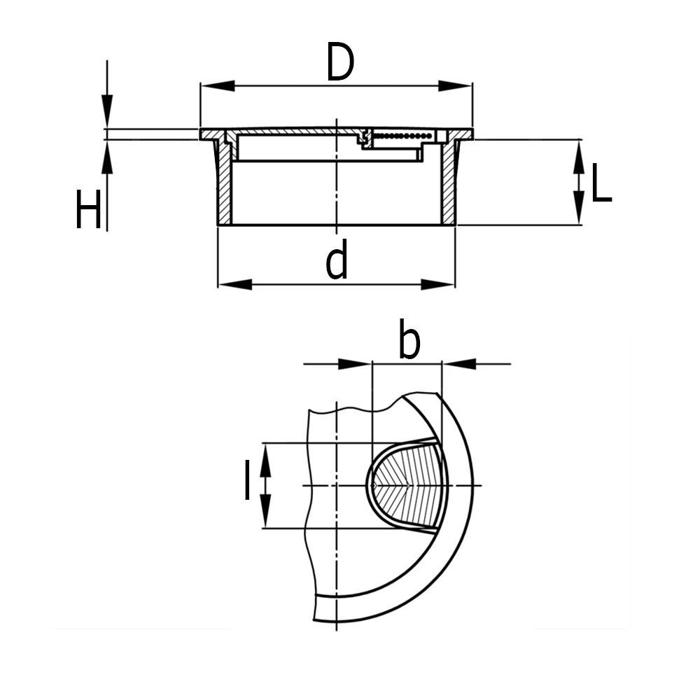 a=width of through hole, Bore=mounting hole Ø, b=width of through hole, D=head Ø, d=shaft Ø, H=head height, L=shaft length