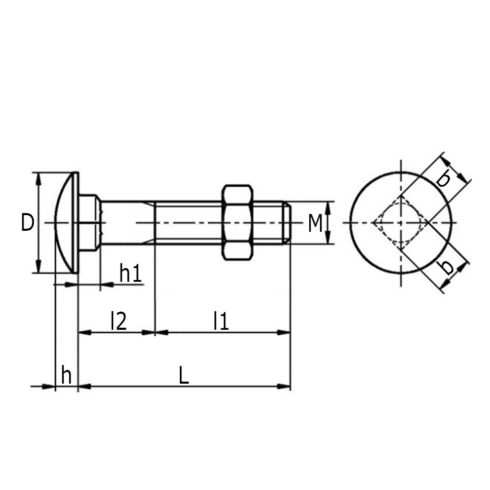 b=width square neck, D=Ø-head, h=head height, h1=height square neck, L=bolt length, l1=thread length, l2=neck-length, M=thread size
