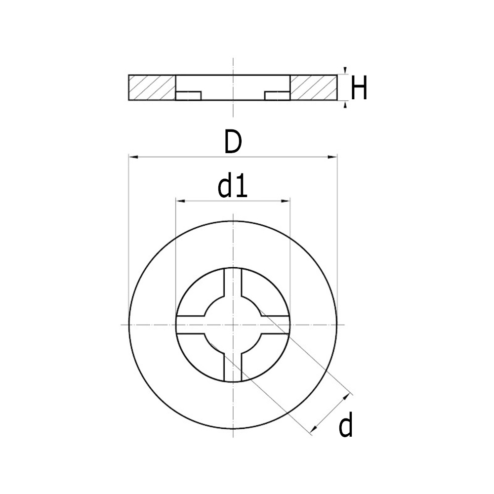 D=outer-Ø, d=hole-Ø, H=washer height, M=Compatible thread sizes