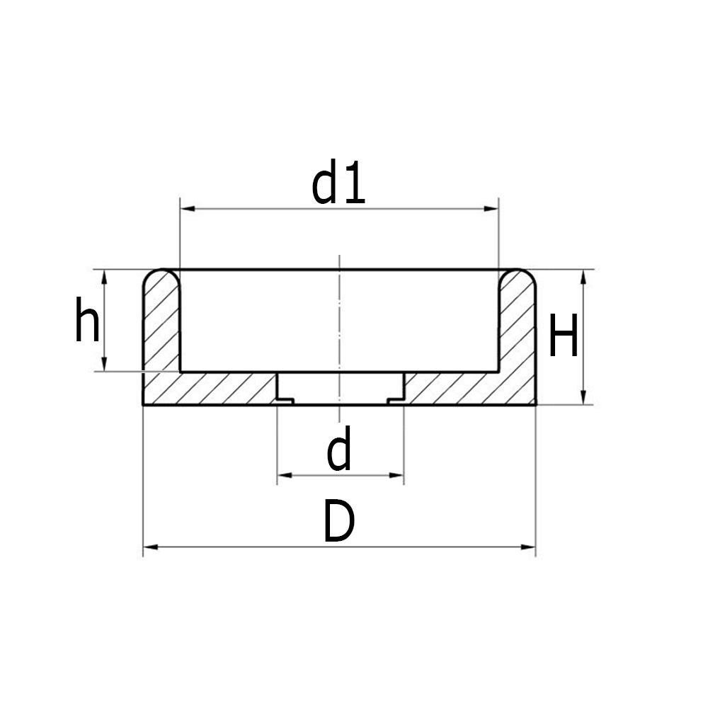 D=outside Ø, d=Ø bore, d1=Ø-countersunk H=overall height, h=height, M=suitable for metric thread