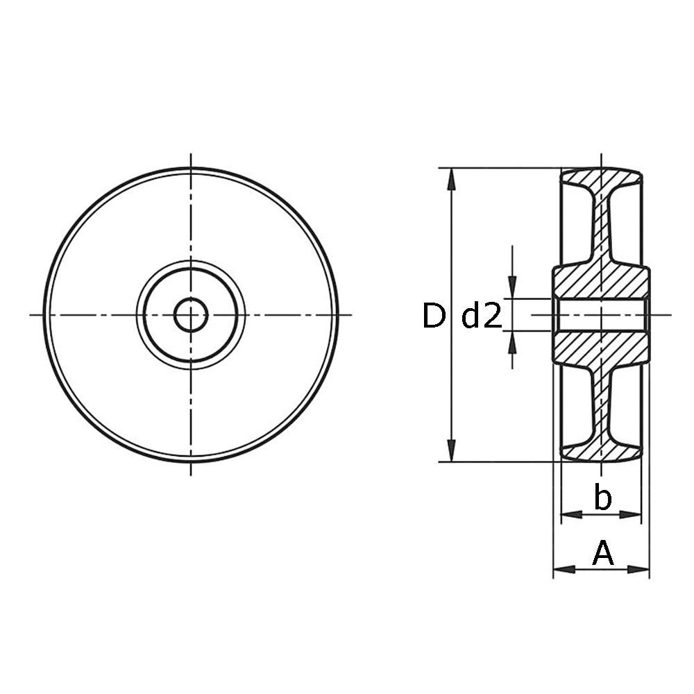 LegendA=hub width, b=tread width, D=Øwheel, d=axle-Ø d2=Ø-shaft bore, K=maximum static load capacity in kg, Tube size=suitable for external tube Ø, Type=wheel bearing type