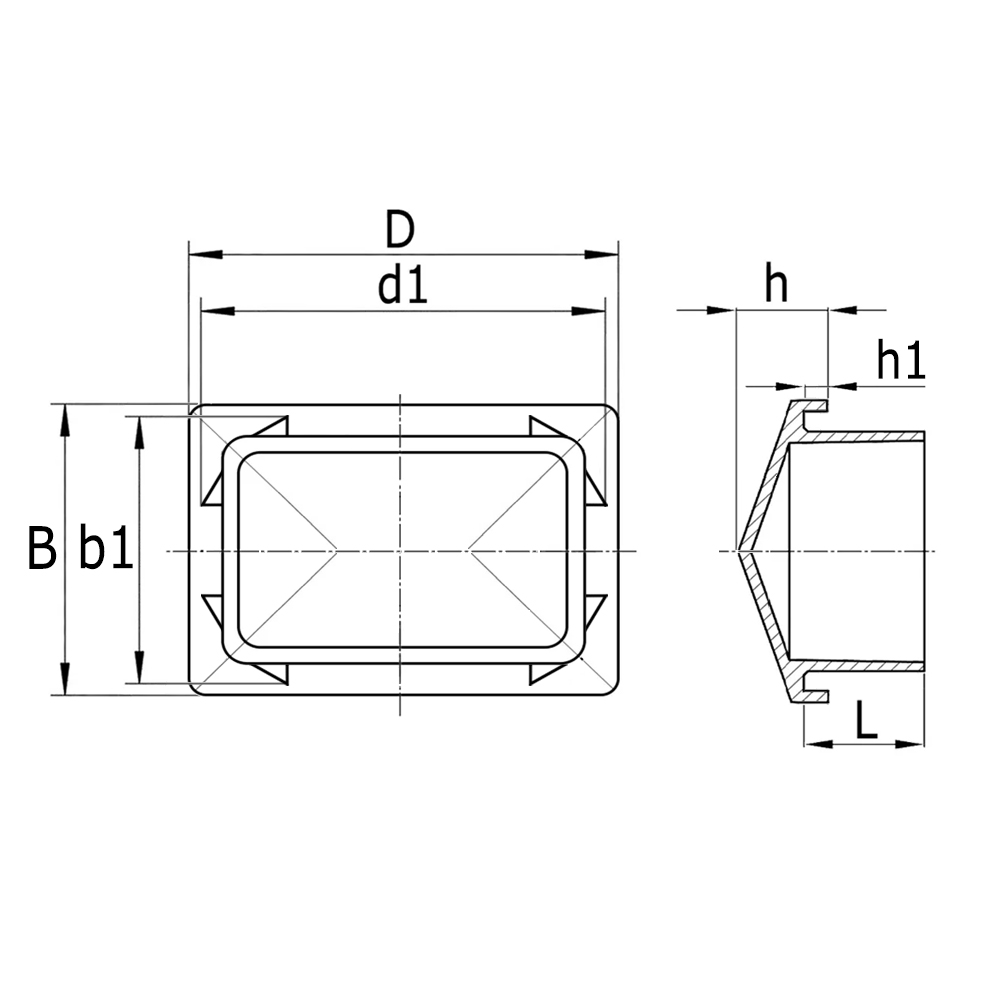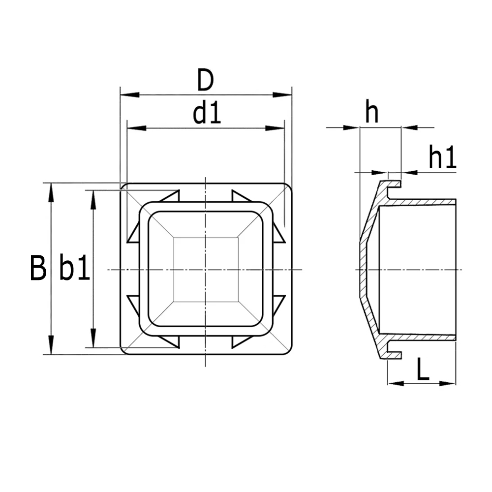 B=Outer width cap, b1=width, Colour/RAL=colour, D=Outer length cap, d1=length, h=Cap height, h1=Inner cap height, L=Schaft length, Tube size= outer post dimensions