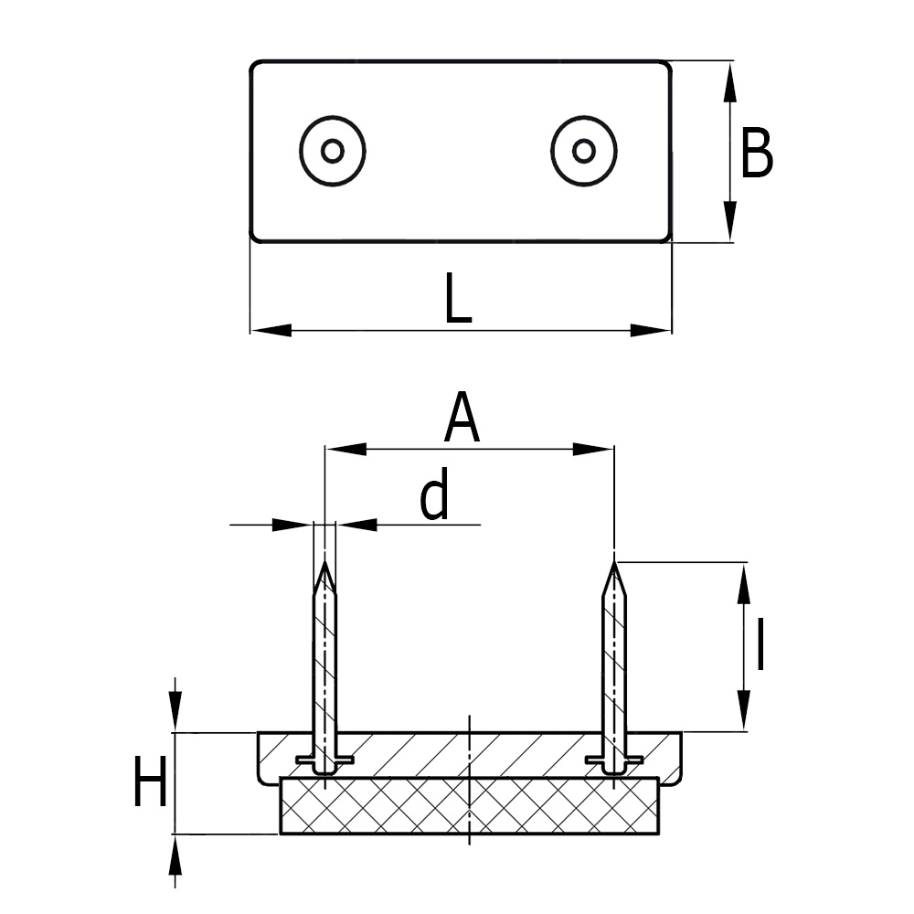 A=distance between nail centres, B=base width, d=nail Ø, H=base thickness, L=base length, l=length of nail