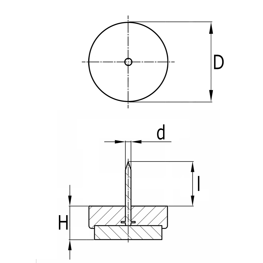 D=plastic Ø, D1=felt Ø, d=nail Ø, H=height, L=length of nail