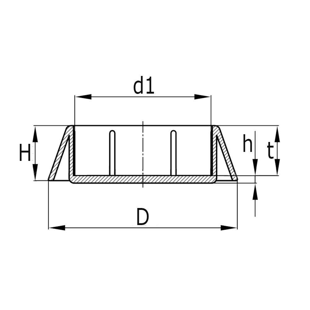 C=inside Ø, D=enlarged base Ø, H=height, T=depth, Tube size=external tube Ø