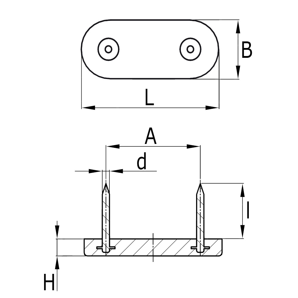 A=distance between nail centres, B=base width, d=nail Ø, H=base thickness, L=base length, l=length of nail