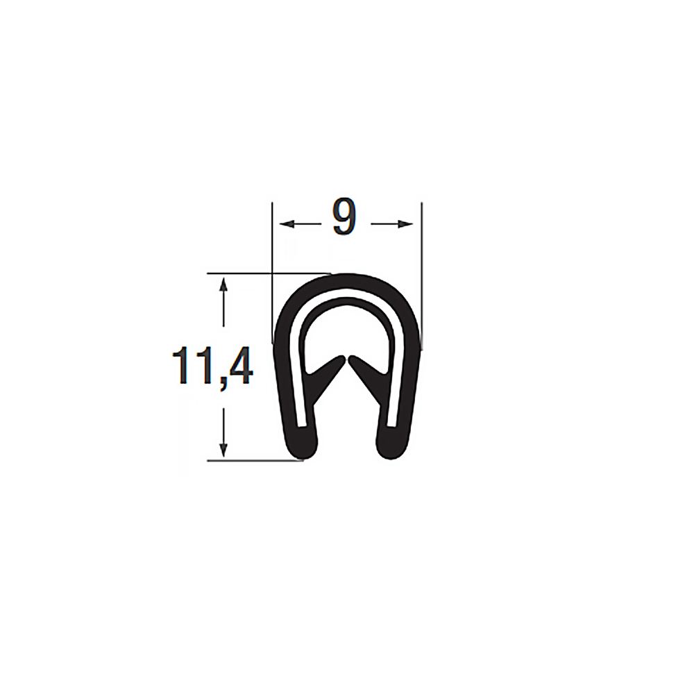 Flexible edge trim 11.4x9mm - PVC with steel spine - clamping range 2-4mmdrawing_1