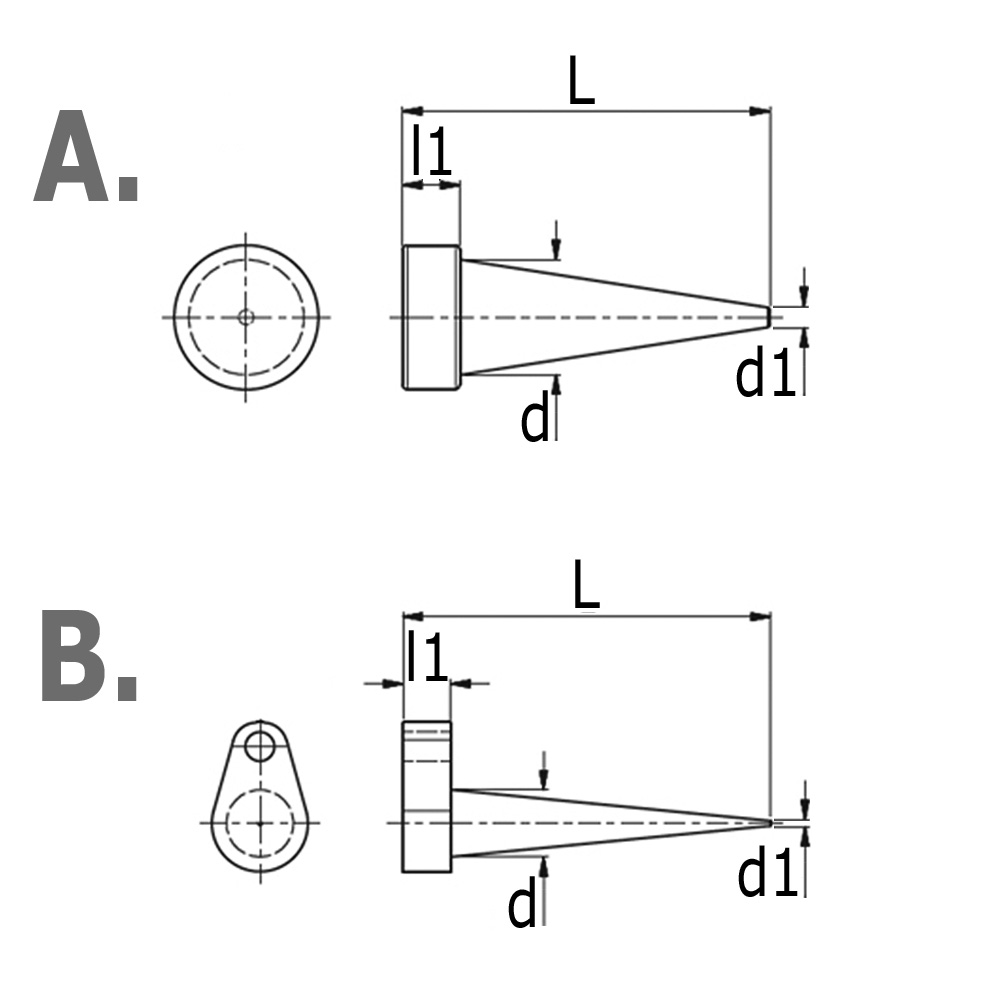 Bore=to fit bores from Ø up to Ø, D=large Ø, d=small Ø, L=overall height, l1=head height
