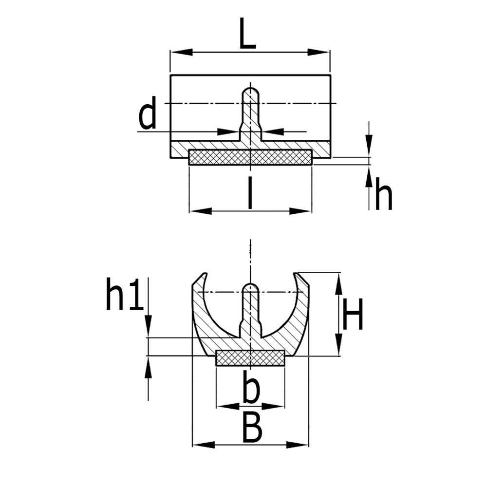 B=width of base, d=peg Ø, H=total height, h1=thickness of base, L=length of base, Tube size=external tube Ø, Type=Model