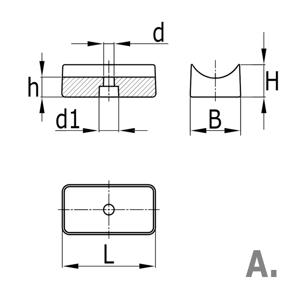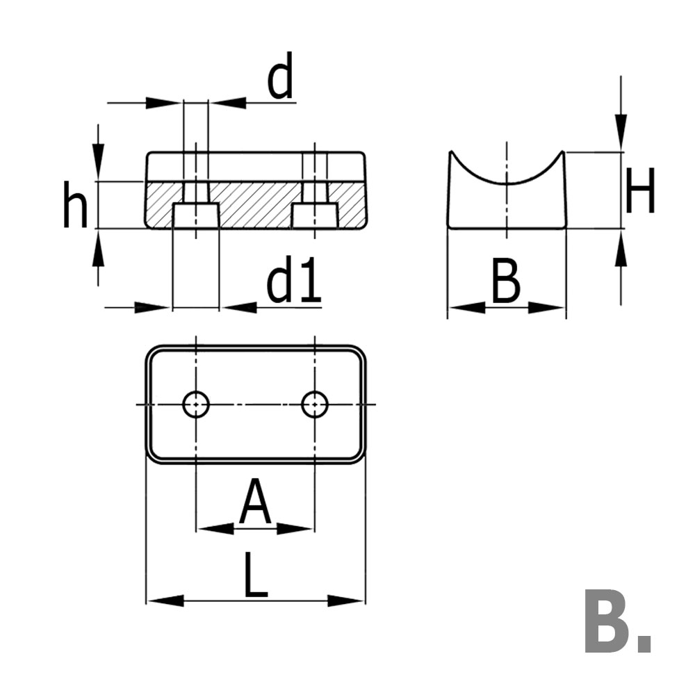 A=dimension between hole centres, B=width of base, d=hole Ø, H=height of base, h=height, L=length of base, Mat.=material, Tube size=external tube Ø, Type=model