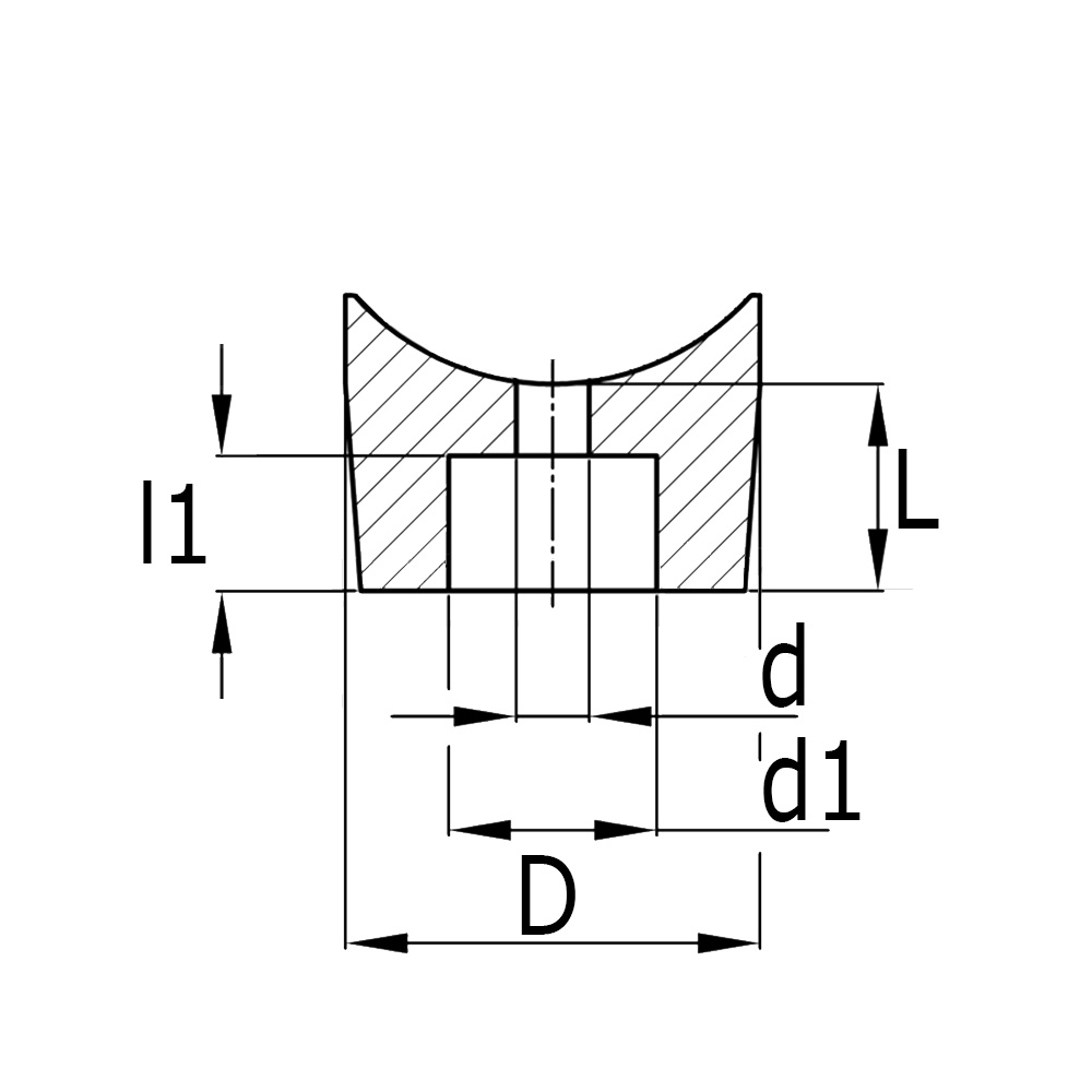 D=foot Ø, d=hole Ø, d1=counterbore Ø, L=height, l1=depth of counterbore, Tube size=external tube dimension