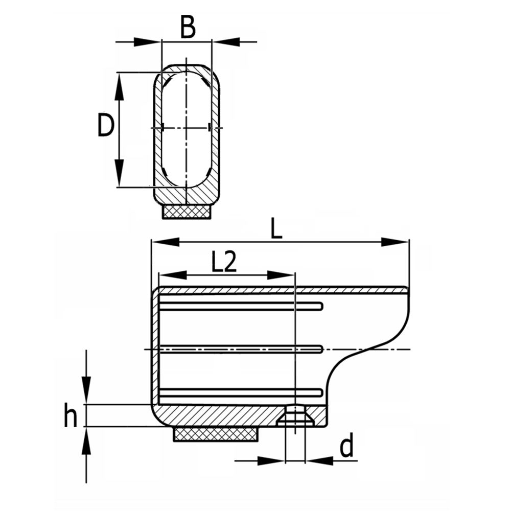 LegendB=internal width, D=internal height, d=hole Ø, h=thickness of base feltpad incl., h1=thickness feltpad, L=length, L2=distance to hole centre, Tube size=tube dimensions