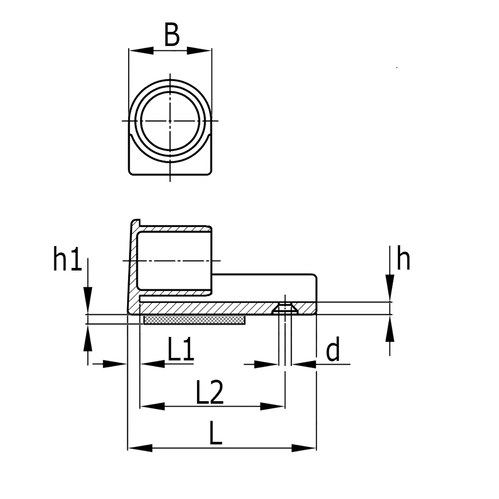 B=width, d=hole Ø, h=height of base, h1=thickness of felt pad, L=length, L1-length, L2=dimension to hole centre, Version=wall thickness, Tube size=external tube Ø
