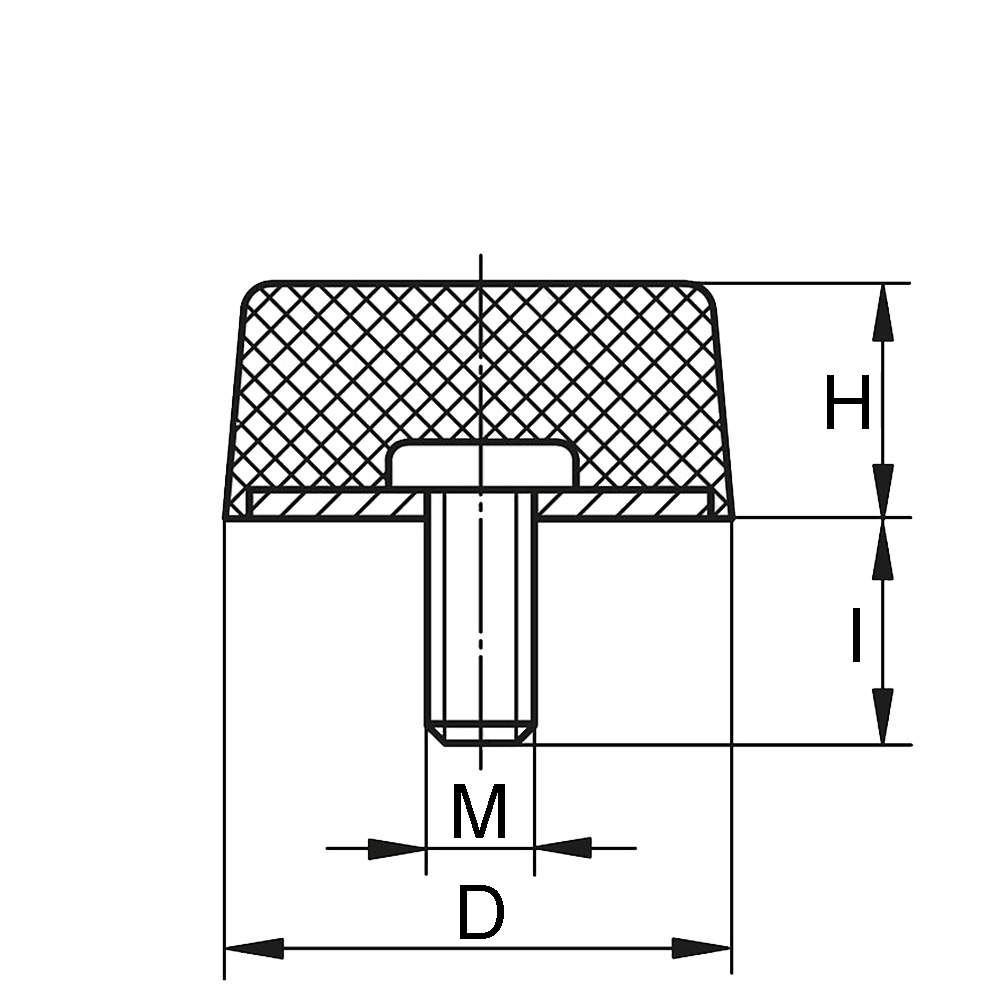 =Available subject to minimum order quantity, D=large Ø, H=height, l=thread length, M=thread size, Mat. A=type of rubber, Mat. B=Material metal components, N=Maximum static load in Newton, Shore A °=Shore-A hardness of the rubber