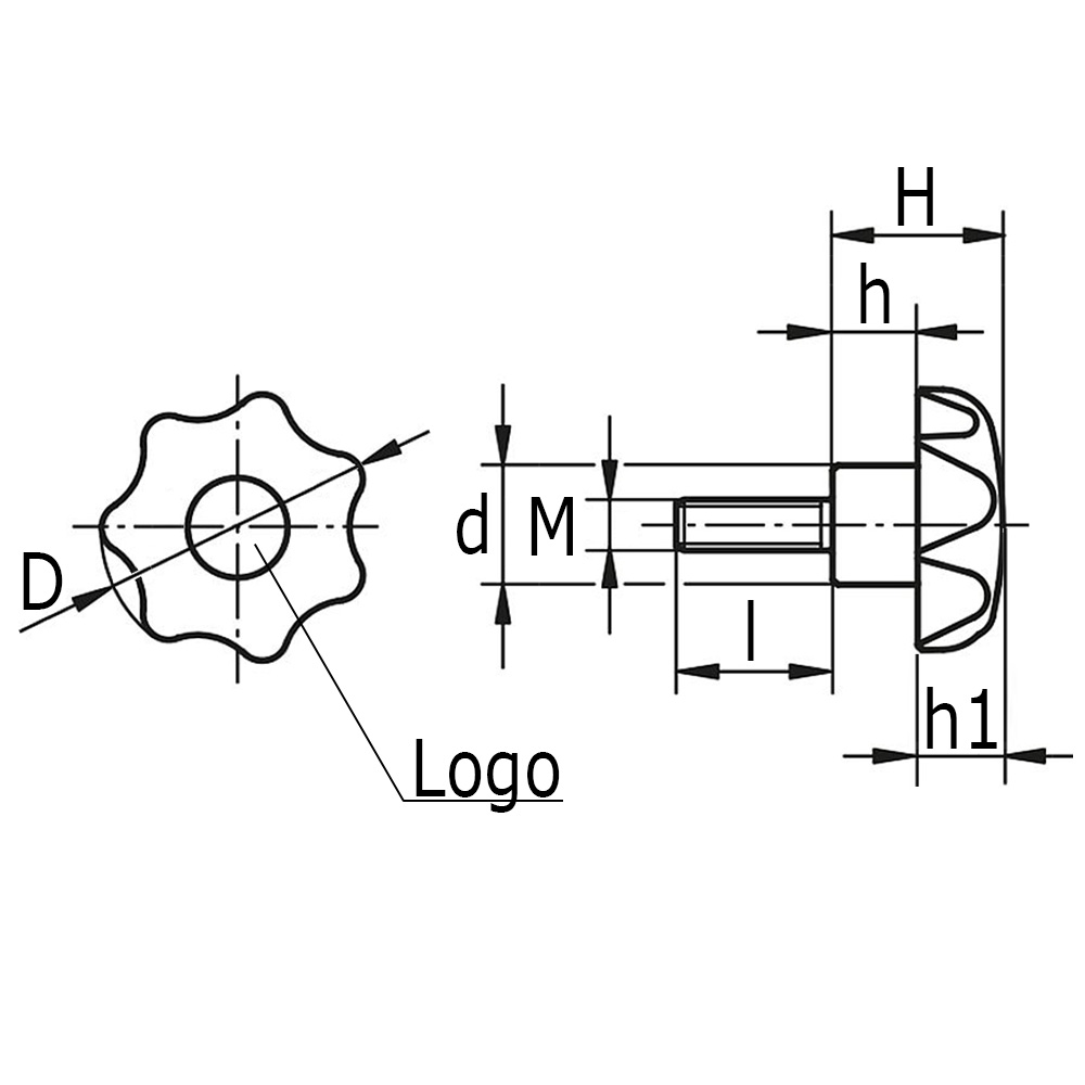 D=knob Ø, d=shaft Ø, H=total height, h=height, h1=height, I=thread length, M=thread size