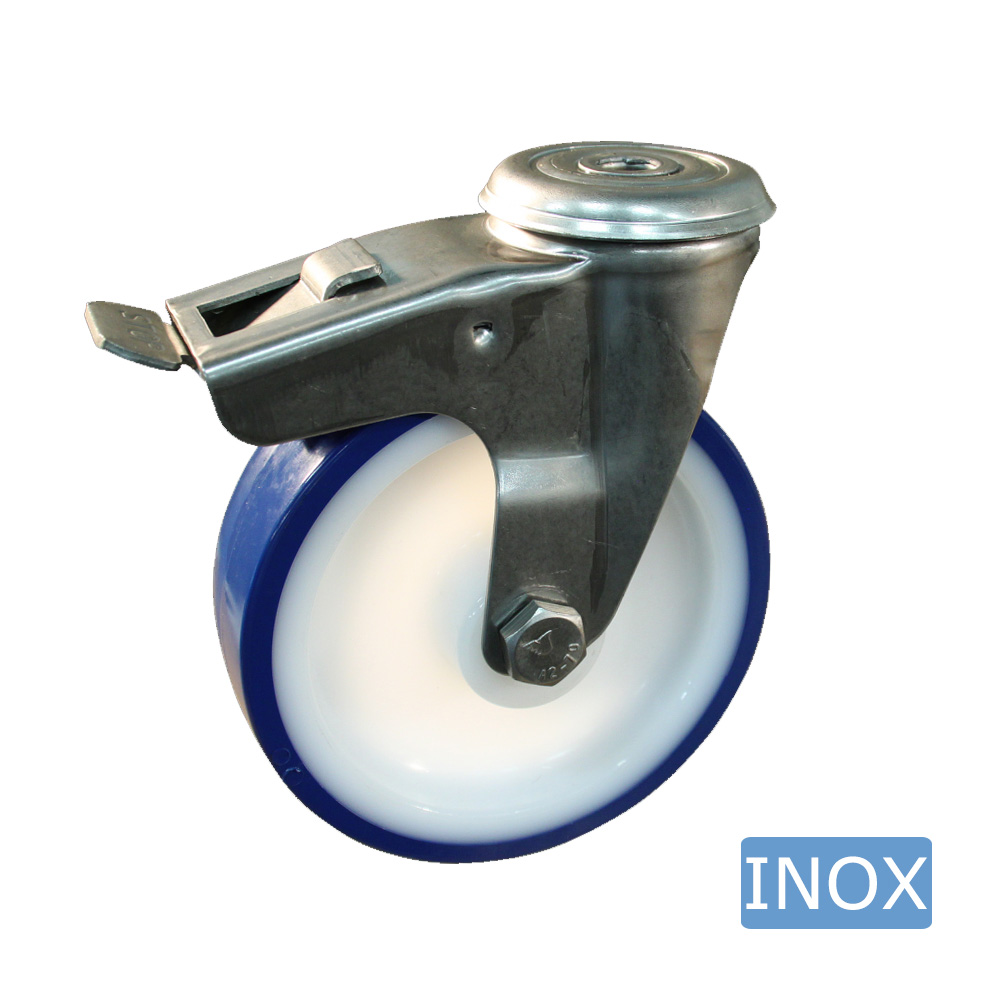 Mounting hole Braked castor, stainless steel, Ø125mm blue TPU tyre - hygiene