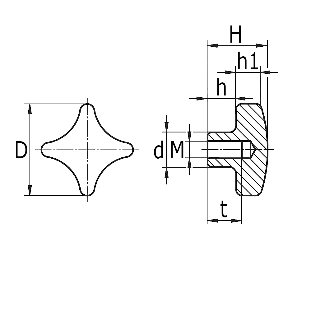 D=knob Ø, d=shoulder Ø, H=total height, h1=height, h2=height of shoulder, M=thread size