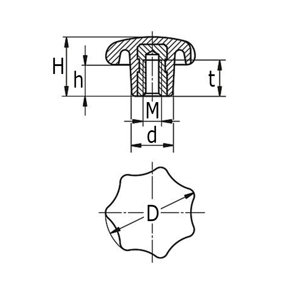 D=knob Ø, d=hub Ø, h=height, M=thread