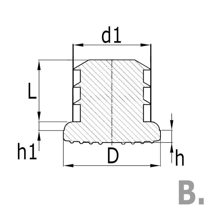 Bore=Suitable for hole size/internal tube size, D=Ø head, d=Ø shaft, d1=Ø ribbing, h=head height, L=shaft length, Version=tube wall thickness, Tube size=external tube size