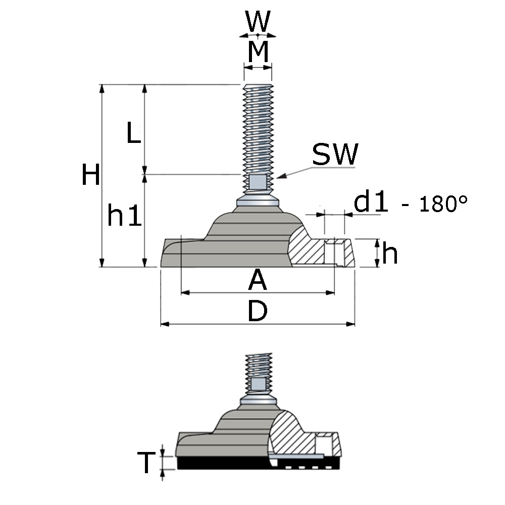 A=total installation height, D=base Ø, d=centre-to-centre dimension between mounting holes, H=thread length, h=height, K= maximum static load in kg, M=thread size, SW=spanner size, W=maximum angle of inclination in °