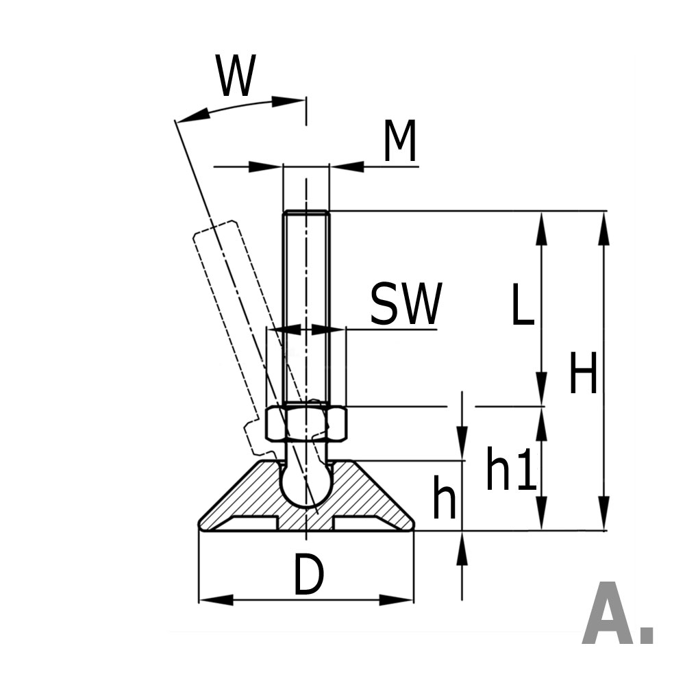 D=foot Ø, H=height, H1=height to top of hexagonal shoulder, L=thread length, M=thread size, SW=spanner size, Type=variant, W=maximum angle of inclination in °