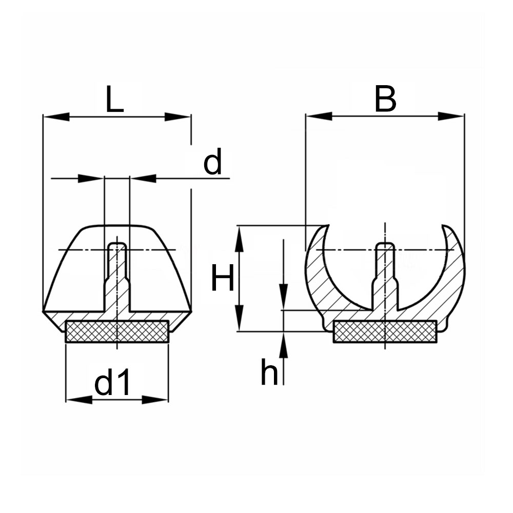 Bore=Bore-Ø in tube, d=Ø-peg, d1=felt pad-Ø, H=Height, h=thickness of the base, L=length, Tube size=external tube Ø