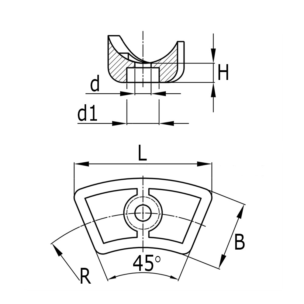 B=width of the base, d=hole Ø, d1=counterbore Ø, h=thickness of the base, R=radius, Tube size=external tube Ø