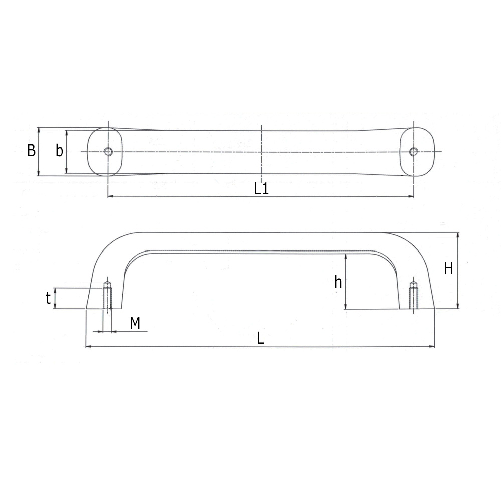 B=width, b=width, H=height, h=height, L=length, L1=centre-to-centred dimension threaded holes, M=thread size, t=depth