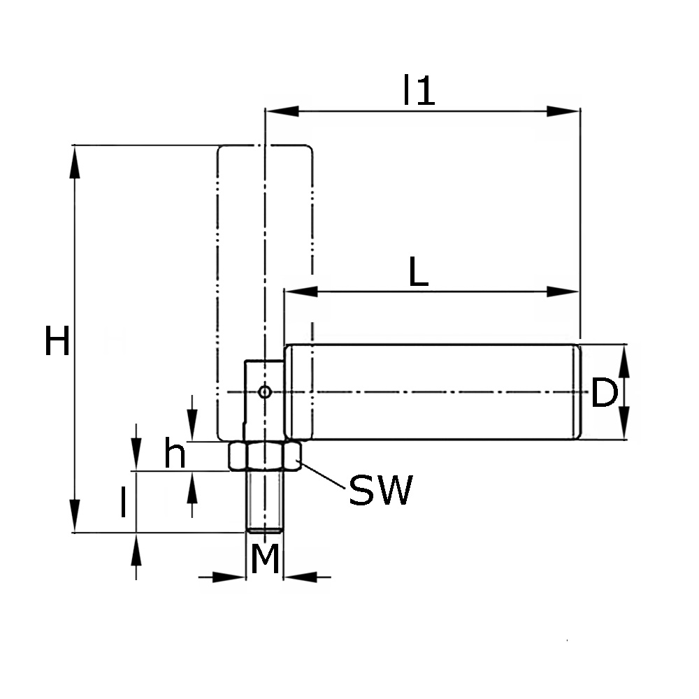D=handle Ø-large, d=height of hexagonal shoulder, L=handle length, l=thread length, M=thread size, SW=spanner size