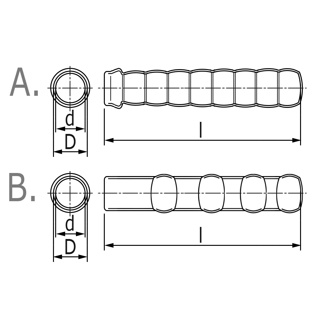 D=outside Ø, d=inside Ø, L=length, Tube size=suitable for tube outside Ø