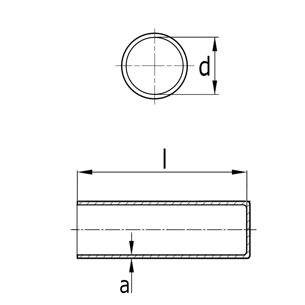 a=Wall thickness, Colour/RAL=Colour and RAL approximately, d=internal Ø, l=end cap length, Tube size=external tube Ø