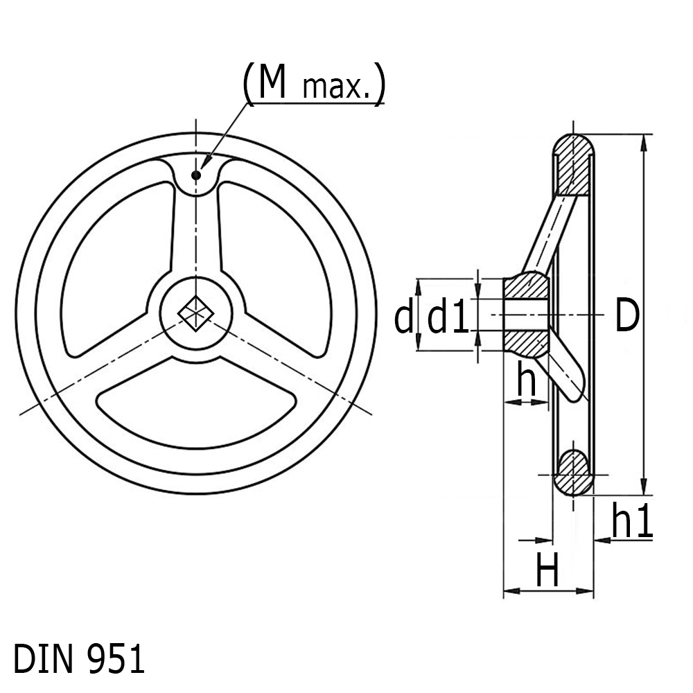 Bore=hole size, DIN=DIN model, D=rim Ø, d=hub Ø, H=total height, h=hub height, h1=rim height, M=maximal threadsize for additional handle (position is precentered)