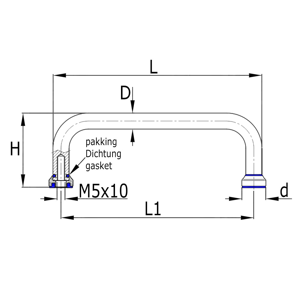D-Handle Stainless steel AISI304 100/110mm M5 with blue seals - Hygiene 3A