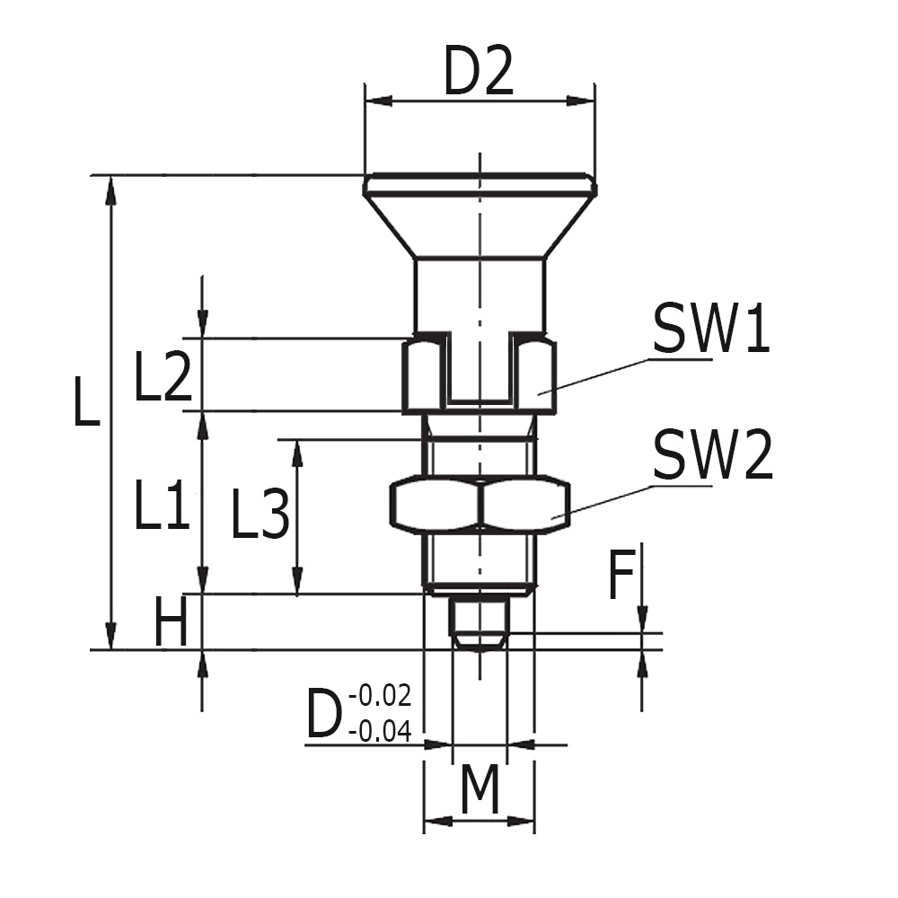 D=Ø-Plunger, D2=Ø-Knob, F=Height Plungerfacet, F1=Spring force initial in Newton, F2=Spring force final in Newton, H=Plungerlength, L=Total length, L1=Length, L2=Height hexagonal bond, L3=Length thread, M=Threadsize (metric fine), SW1=Spannerwidth collar, SW2=Spannerwidth lock nut
